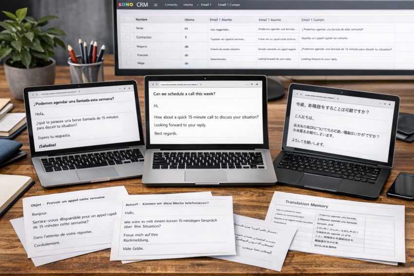 Comment l’appliquer à Zoho CRM sans se compliquer ? L’idée est de gérer vos messages (sujets et corps) comme du « contenu exportable ». De nombreuses entreprises suivent un processus simple : elles extraient les textes depuis leur bibliothèque (ou depuis une feuille structurée) avec un identifiant par message ; traduisent ce contenu via des outils compatibles avec des mémoires de traduction ; et réimportent les versions traduites dans Zoho pour que le système remplisse les champs finaux selon la langue parametrée. Ainsi, lorsque vous mettez à jour un texte de base, le processus détecte les répétitions et facilite le travail.